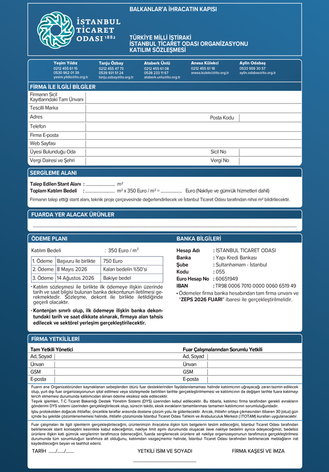 2 – 5 Eylül 2026 tarihleri arasında düzenlenecek Zeps Fuarı’nda, her katılımcı firmaya İstanbul Ticaret Odası tarafından günlük 5 potansiyel alıcı firma ile ikili iş görüşmesi organizasyonu sağlanacaktır.