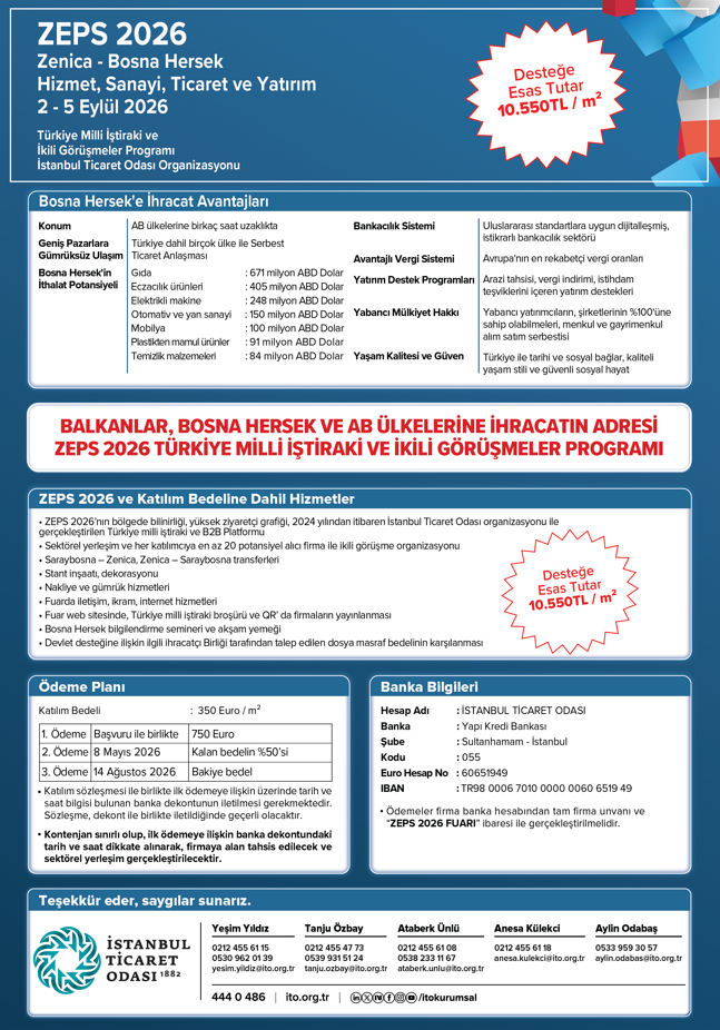 Bu kapsamda, Bosna Hersek’in sanayi merkezlerinden Zenica’da 30 yılı aşkın süredir düzenlenen Zeps Fuarı’nın Türkiye milli iştiraki ve ikili iş görüşmeleri organizasyonu 2024 yılından itibaren İstanbul Ticaret Odası tarafından gerçekleştirilmektedir.