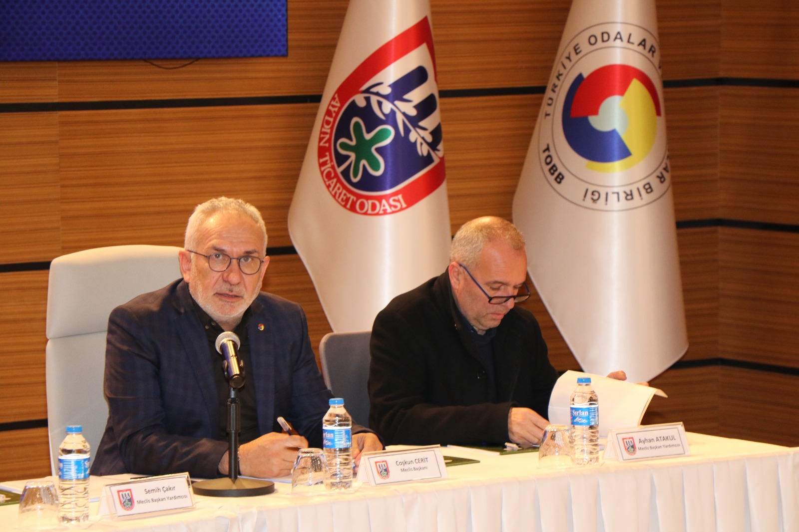 Aydın Ticaret Odası (AYTO) Ocak Ayı Olağan Meclis Toplantısı, AYTO Meclis Başkanı Coşkun Cerit’in başkanlığında AYTO M. Rıfat Hisarcıklıoğlu Konferans Salonu'nda düzenlendi. Toplantıda söz alan TOBB Yönetim Kurulu Üyesi ve Odamız Başkanı Hakan Ülken, AYTO’nun Ocak ayında yerel ve ulusal düzeyde yürüttüğü çalışmalar ve gerçekleştirdiği görüşmeler hakkında bilgi verdi. Ülken, Ocak ayında öne çıkan ekonomik başlıklara ilişkin de değerlendirmelerini ifade etti.