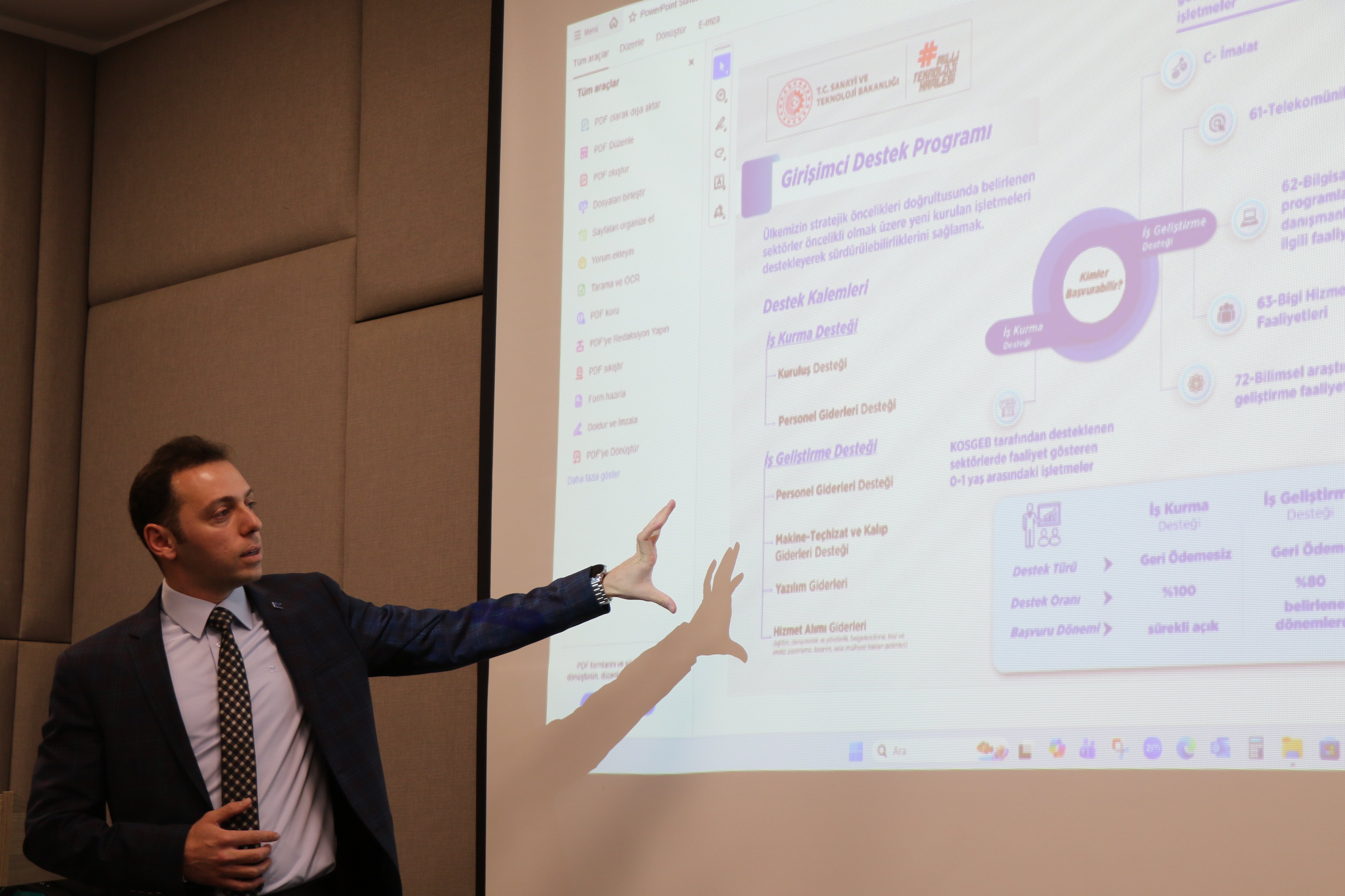 KOSGEB Aydın İl Müdürü Berkay Çetin Oral, toplantıda, İmalat Sanayi İçin Kredi Finansmanı ve İstihdamı Koruma Programı başta olmak üzere KOSGEB destekleri hakkında kapsamlı bilgiler paylaştı.