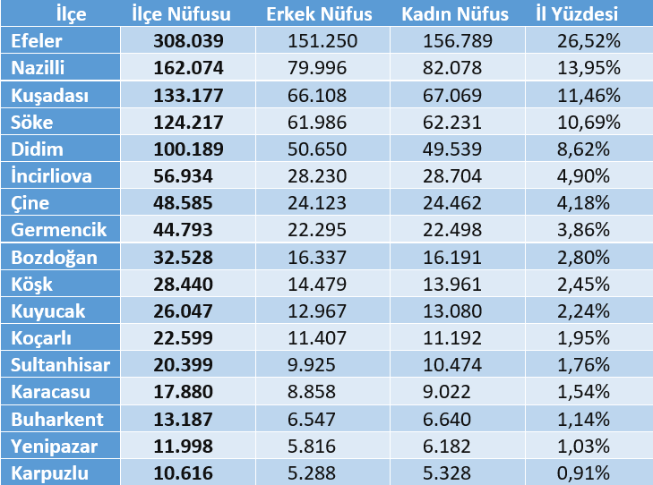 En kalabalık ilçe Efeler’de 308.039 kişi ikamet etmektedir. Bu durum toplam il nüfusunun %25,6 sına karşılık gelmektedir. En az nüfuslu ilçe Karpuzlu’da 10.616 kişi ikamet etmektedir.