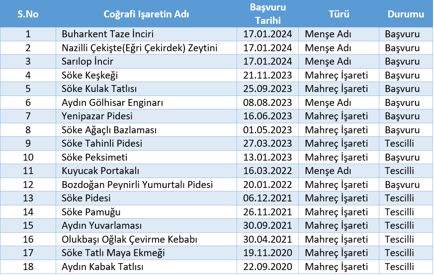 Aydın Ticaret Odası, Aydın’nın yıllar boyu süregelen değer ve geleneklerinin sonucu olan yerel ürünlerinin korunması için yoğun bir biçimde diğer kurum ve kuruluşlar ile beraber çalışmaktadır. Aydın’nın halihazırda toplam 28 tescilli coğrafi işareti bulunmakta olup, bunun yanında 10 tane de başvurusu yapılmış ve tescil için değerlendirme sürecinde olan ürünü bulunmaktadır.