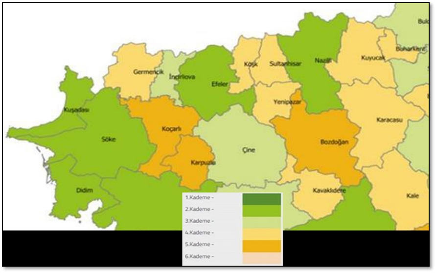 Sanayi ve Teknoloji Bakanlığı tarafından yayımlanan İlçe SEGE-2022 raporu, sosyoekonomik gelişmişliği temsil eden çeşitli boyutları değerlendirir. Demografi, eğitim, istihdam, sağlık, finans, rekabetçilik, yenilik ve yaşam kalitesi gibi başlıklar altında hesaplanan gelişmişlik skorları altı kademede sınıflandırılır. Aydın İli'nde, birinci kademede hiç ilçe bulunmazken, ikinci kademede beş ilçe, üçüncü kademede iki ilçe, dördüncü kademede altı ilçe ve beşinci kademede üç ilçe bulunmaktadır. Bölgede altıncı kademede ise hiç ilçe bulunmamaktadır.